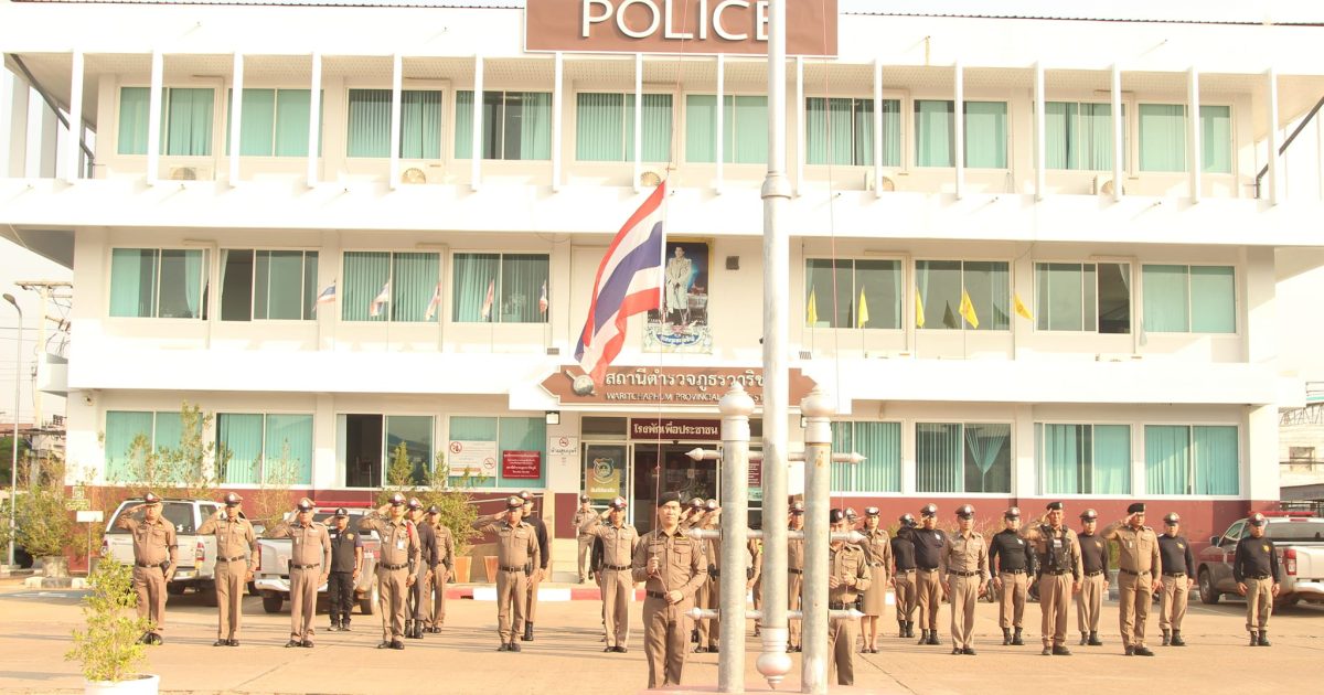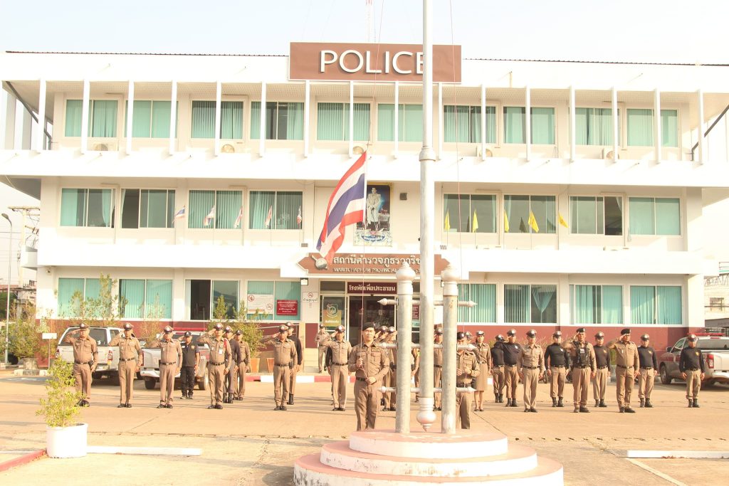 กิจกรรมเคารพธงชาติประจำสัปดาห์ 20 กุมภาพันธ์ 2024 โดย waritchaphum / ข่าวประชาสัมพันธ์,ข่าวกิจกรรม,งานอำนวยการ วันนี้(๒๐ ก.พ.๒๕๖๗) เวลา ๐๘.๓๐ น. พ.ต.อ.อิทธิศักดิ์ สัจจาทวีสิน ผกก.สภ.วาริชภูมิ นำข้าราชการตำรวจในสังกัด เคารพธงชาติ สวดมนต์ไหว้พระ กล่าวบทปลงใจ กล่าวอุดมคติตำรวจ ตรวจความพร้อมประชุมถ่ายทอดนโยบาย ข้อราชการ ข้อสั่งการของผู้บังคับบัญชา