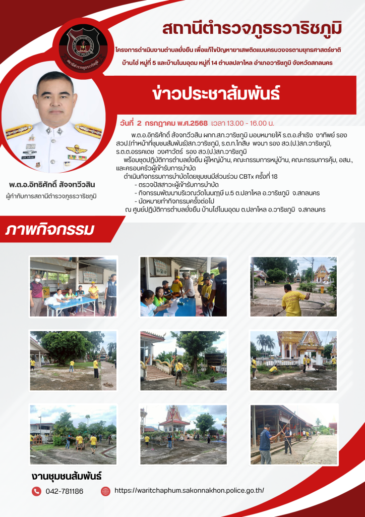 ตำบลยั่งยืนฯ บ้านไฮ่ – บ้านโนนอุดม 2 กรกฎาคม 2025 โดย waritchaphum / ข่าวประชาสัมพันธ์,ข่าวกิจกรรม,งานป้องกันปราบปราม,ไม่มีหมวดหมู่ วันที่ 2 กรกฎาคม 2568 เวลา 13.30 น. ชุด ชป.ตย.สภ.วาริชภูมิ พร้อมคณะผู้นำชุมชนนำผู้เข้าร่วมกิจกรรม ตำบลยั่งงยืนฯ พัฒนา ทำความสะอาดตัดหญ้า ในบริเวณวัดโนนฤๅษี ต.ปลาโหล อ.วาริชภูมิ จ.สกลนคร